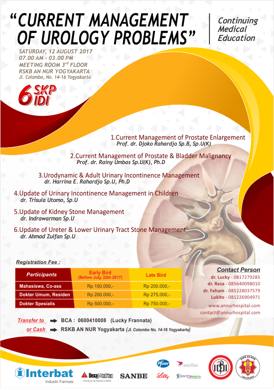 SEMINAR NASIONAL CME RSKB An Nur Yogyakarta 'Current Management of Urology Problems' Bagaimanakah manajemen LUTS yang tepat? Kapankah TUR-B sebaiknya dilakukan pada kasus tumor buli? Apa saja kriteria pasien yang memerlukan Urodynamic? Bagaimanakah perkembangan tata laksana Batu Saluran Kemih saat ini? Dapatkan jawabannya pada CME RSKB An Nur Yogyakarta : 'Current Management of Urology Problems' CME ini akan mengangkat 4 tema yaitu